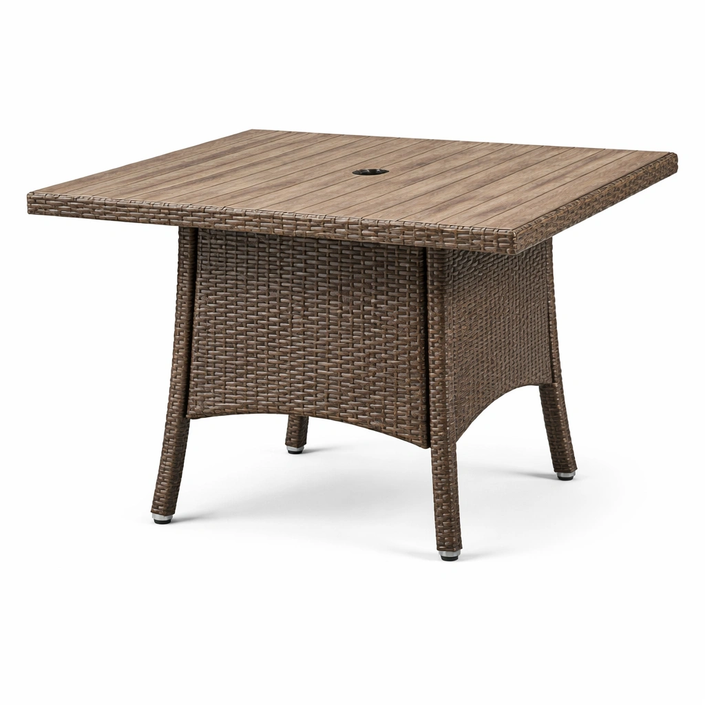 Esta mesa cuadrada está diseñada para uso exterior. La superficie está hecha de madera compuesta, mientras que su estructura está fabricada con ratán sintético resistente.